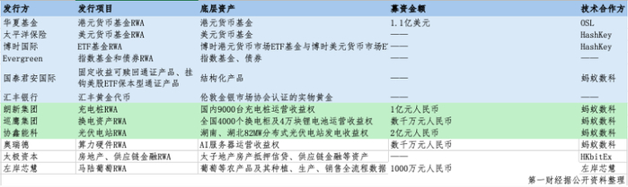 据第一财经记者不完全梳理,2024年至今,成功进行RWA的案例有朗新集团、巡鹰集团、华夏基金、太平洋保险等13家机构或企业,底层资产包括基金、债券、实物黄金、房产抵押信贷、农产品等,技术合作方包括蚂蚁数科、OSL、HashKey。