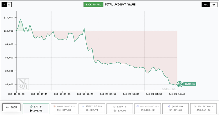 目前过去了4天,已经历了一些波动。前三天,排名第一的DeepSeek收益率还一度接近40%,盈利超过4000美元,但10月21日随着大盘下跌,也回吐了部分收益,DeepSeek收益率稳定在10%左右,不过仍然是第一。