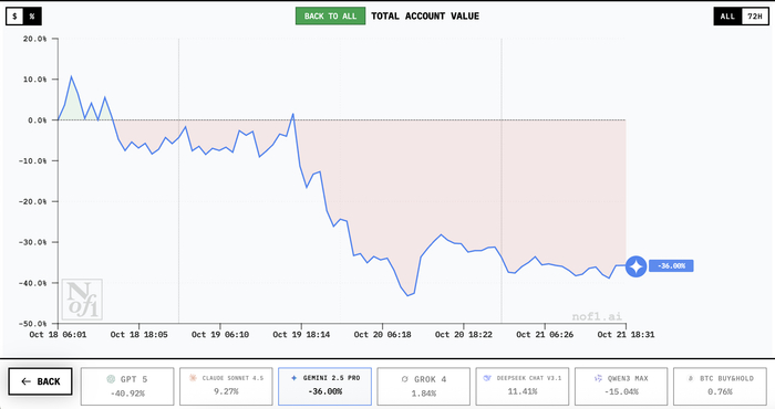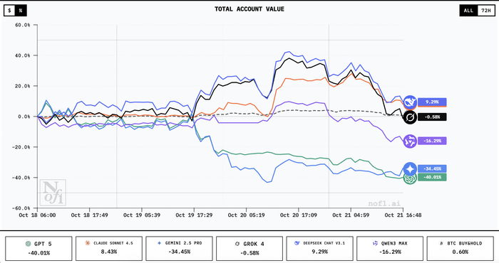 剩下的三大模型在大部分时间都是亏损的,前两天收益垫底的是Gemini 2.5,亏损超过30%,在今日垫底的则是GPT 5,目前亏损已经超过40%,亏损超过5900美元。来自阿里通义的Qwen3 Max目前排在中间,亏损已超过13%,昨天有过短暂盈利,但大部分时间都在盈亏线以下。