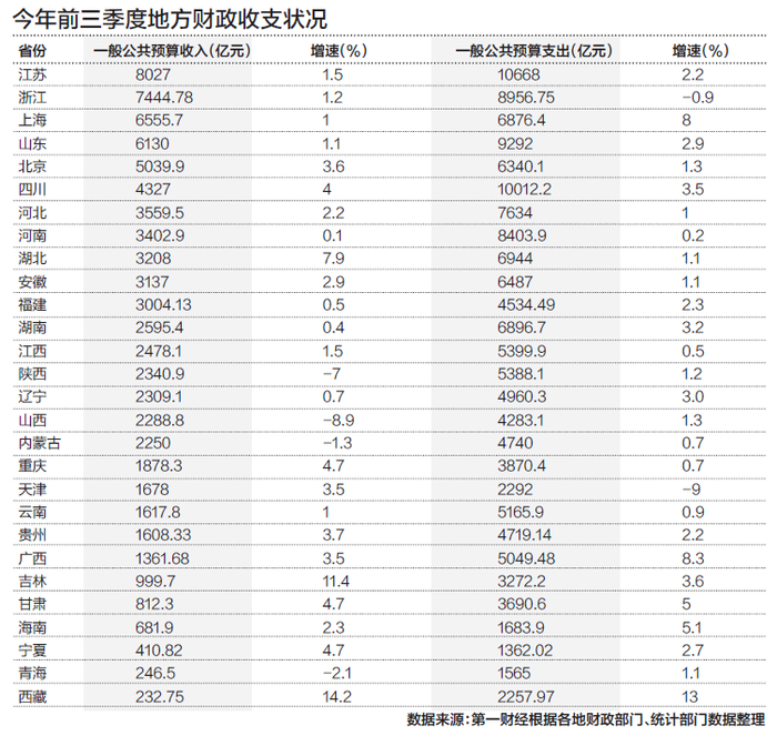 地方政府近期相继公开前三季度财政账本,总体来看地方财政收入保持小幅增长,较为平稳,而财政支出总体也保持小幅增长,支出普遍高出收入,以稳经济、保民生。