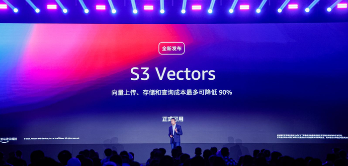 其次是存储形态的革命性创新:Amazon S3 Vectors。在RAG(检索增强生成)日益普及的今天,向量数据成为企业的核心资产。传统的向量数据库方案虽然快,但成本高昂且难以维护海量数据。本次正式发布的S3 Vectors让用户可以在S3中直接存储和管理数万亿级的向量数据,并将存储与查询的总体成本降低90%。同时Amazon OpenSearch Service新增了GPU向量索引加速功能,能够提升10倍的创建速度,成本只需原来的四分之一。