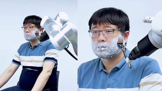 去年,上海交通大学卢策吾教授亲自体验其团队研发成果的过程——在一个具身智能大模型操控下,机械臂完成了刮胡子的动作。受访对象供图