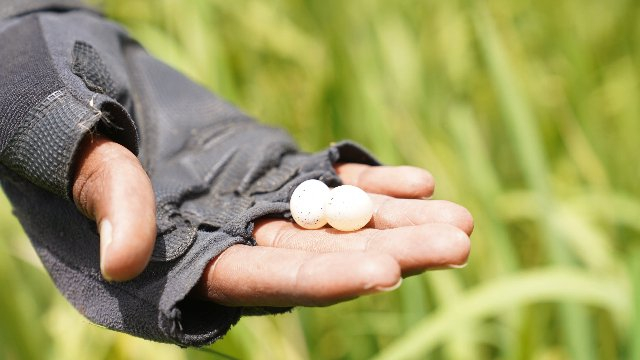 从小池塘转身时,塔希鲁又有新的发现,他将两枚白色的鸟蛋向记者展示,他解释道,天上飞的黄顶巧织雀特别喜爱在ISRIZ-12稻田中筑巢,因为相比本地品种,ISRIZ-12植株密集高大,更有利于隐藏鸟巢。而植株高挺的特点还有利于稻田去除杂草,因为种下稻秧一个多月后,ISRIZ-12就超过了杂草的高度,使它吸收不到阳光,抑制进一步生长。