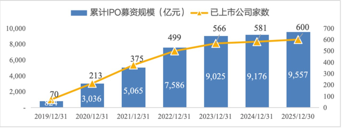 从首批25家拓荒者,到如今600家公司集结,科创板的融资规模也不断增加。截至12月30日,IPO募集资金9557亿元,再融资募集资金2139亿元,合计超1.1万亿元。