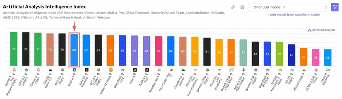 新版本模型在多项主流公开基准测试中取得开源模型中的最佳表现。在全球知名的权威大模型评测榜单Artificial Analysis Intelligence Index(AA智能指数)中,GLM-4.7以68分综合成绩荣登开源模型与国产模型双料榜首。在全球百万用户参与盲测的权威编码评估系统Code Arena中,GLM-4.7位列开源第一、国产第一。