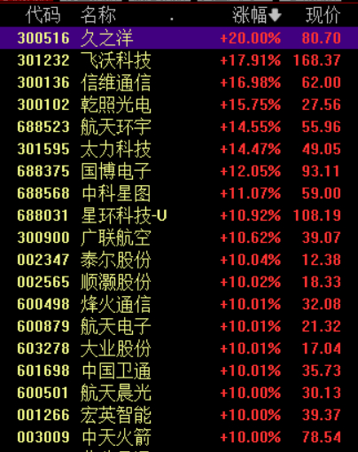 具体来看,商业航天概念延续强势,北斗星通、烽火通信、雷科防务等20股涨停。