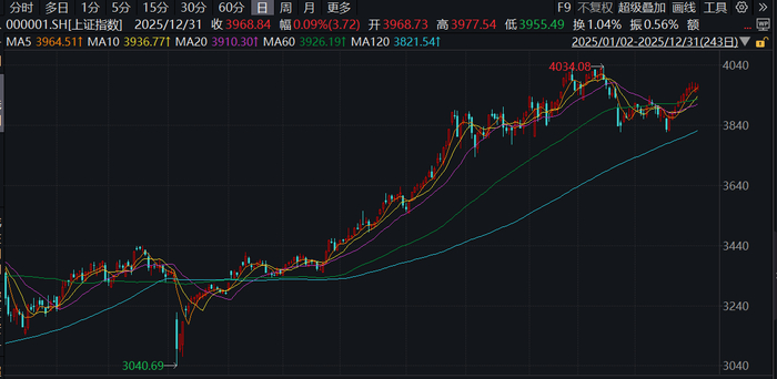 12月31日,A股2025年交易收官,截至收盘,沪指涨0.09%录得11连阳,全年收涨18.41%创10年新高;深成指跌0.58%,全年收涨29.87%;创业板指跌1.23%,全年大涨49.57%。科创50指数全年涨35.92%,北证50指数全年涨38.8%。
