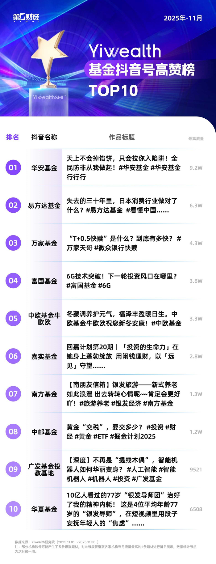 11月期间,多家基金公司在抖音平台发布的投资者教育内容表现突出,覆盖反诈警示、实用理财知识、行业热点解读等多个维度,获得了用户的广泛关注与点赞。华安基金采用小剧场形式,演绎“高收益、稳赚不赔”类理财骗局,生动形象地提示公众防范非法金融活动,相关视频获得近10万点赞。易方达基金则以日本“失去的三十年”为背景,深入分析消费行业在经济增长停滞期的转型策略,为中国消费领域发展提供参考,该内容以6.3万点赞位居抖音高赞榜第二位。万家基金围绕“T+0.5”快赎机制,解析其底层逻辑及对投资者的实际益处,实用性较强的科普获得了4.3万点赞。中邮基金则聚焦黄金投资中的“交税”问题,助力用户拓展理财知识面。此外,富国基金与广发基金投教基地将目光投向科技前沿,分别解读6G通信与智能机器人行业,为用户带来具有前瞻性的投资视野。
