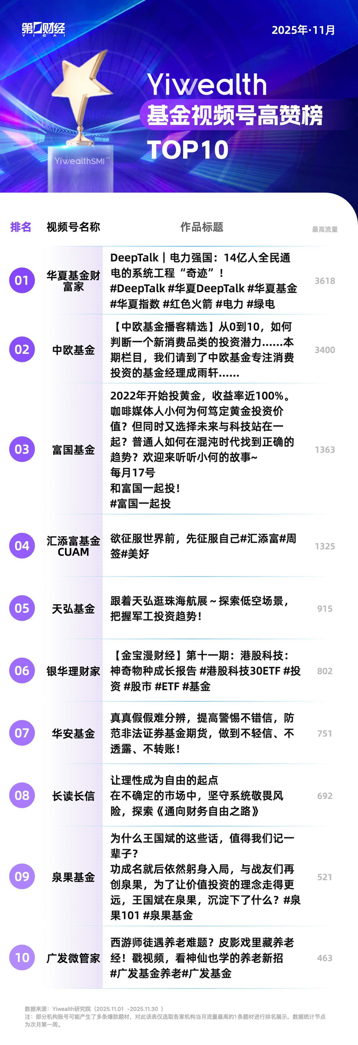 11月基金视频号高赞榜作品呈现出显著的内容深度化、专业化的趋势,能够提供具有长期价值的优质内容更易获得用户青睐。例如,华夏基金财富家栏目“DeepTalk”以中国电力工业发展为主题,通过讲述电力系统从薄弱到强大的历程,解读其中的建设难点与技术突破,既展现国家基建实力,也唤起观众的民族自豪感,视频收获超3千点赞。中欧基金则精选旗下播客内容,分享“从0到10,如何判断一个新消费品类的投资潜力”,此类高实用性的投资方法论也赢得了用户的广泛认可。