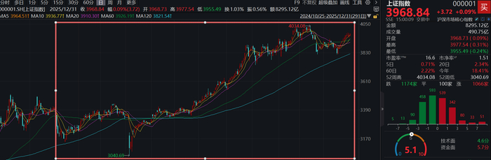 2025年,沪指报收3968.84点,全年收涨18.41%,年内时隔十年重回4000点;创业板指全年大涨49.57%。