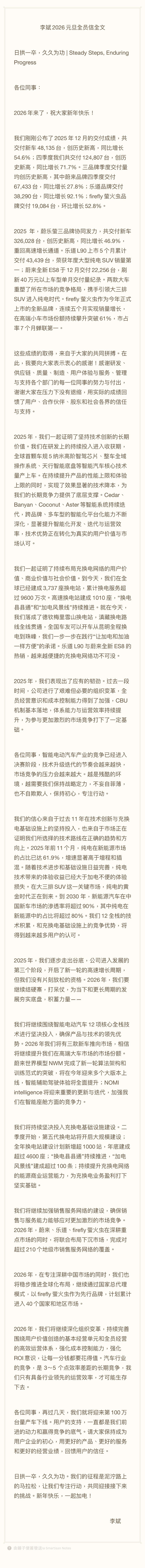 李斌还在信中提到了2026年的残酷竞争。他说,智能电动汽车产业的竞争已经进入决赛阶段,技术升级迭代的节奏会越来越快,市场竞争的压力会越来越大。