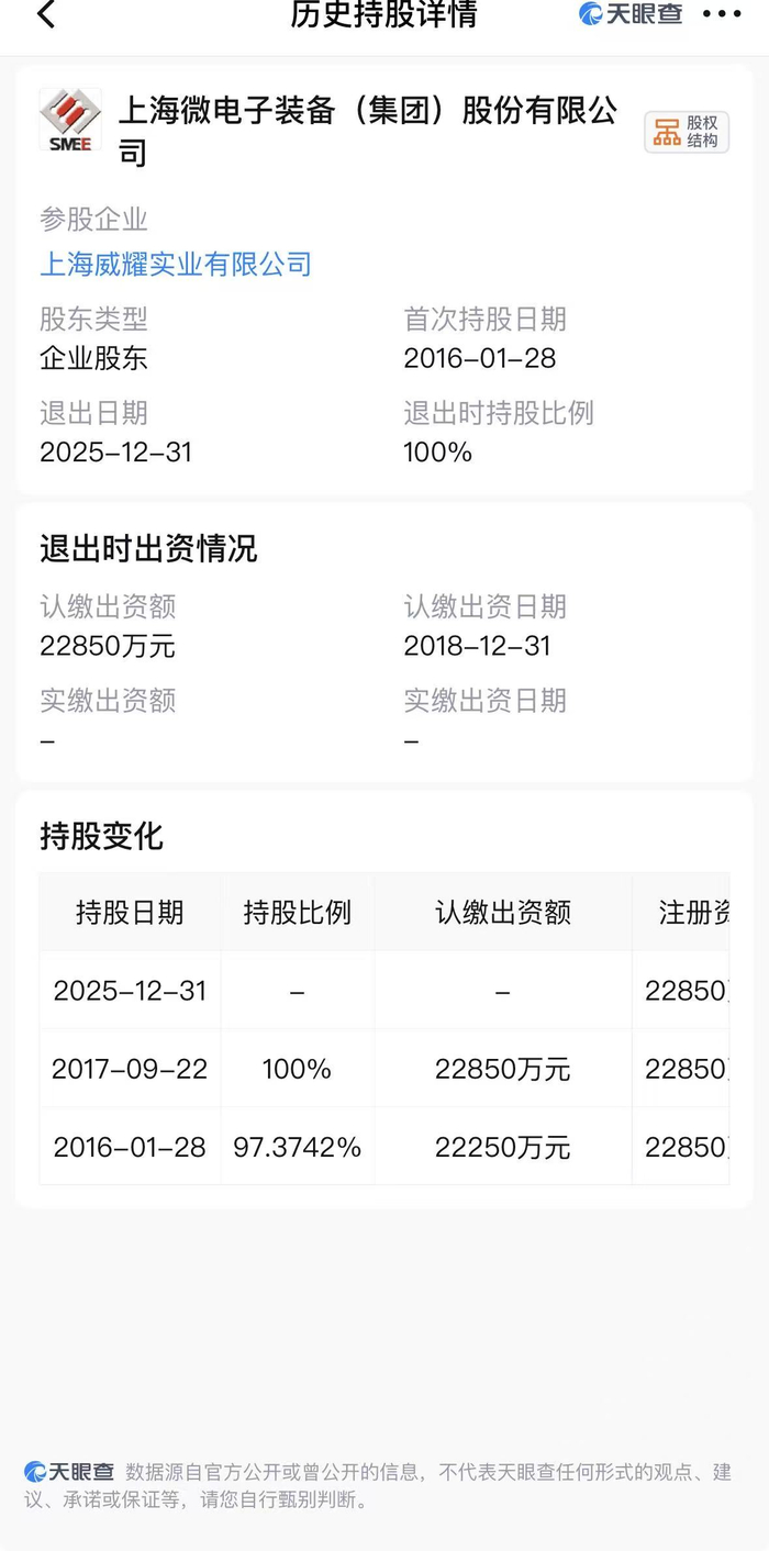 天眼查信息显示,近日,上海威耀实业有限公司(下称:“威耀实业”)发生股东信息变更。此前,上海微电子装备(集团)股份有限公司(下称:“上海微电子”)是这家公司持股100%的股东,认缴出资额为2.285亿元。上海微电子退出后,上海芯上微装科技股份有限公司(下称:“芯上微装”)成为威耀实业的新增全资股东,认缴出资额同样为2.285亿元。