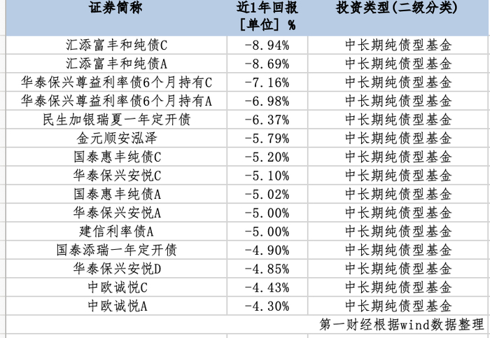 部分基金近一年亏损超过5%,汇添富丰和纯债A/C、华泰保兴尊益利率债6个月持有A/C、民生加银瑞夏一年定开债等下跌幅度居前。与之相比,短期纯债型基金出现亏损的比例并不大。