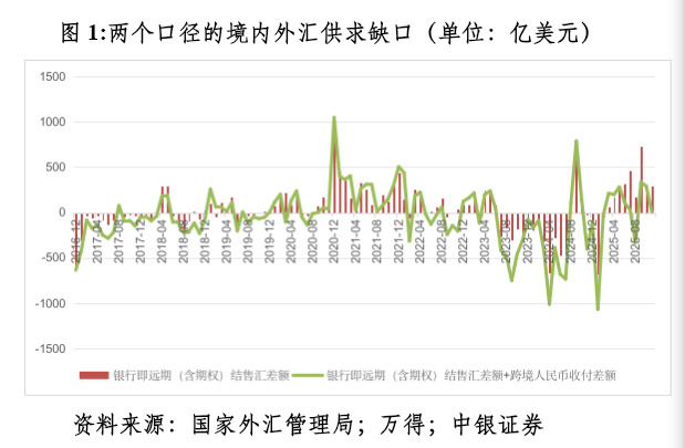 人民币升破7发生在2025年12月。当月,境内交易价相对中间价、离岸人民币汇率(CNH)相对在岸人民币汇率(CNY)转为持续在偏强方向。人们有理由怀疑“这次不一样”。因为月度外汇收支数据要到2026年1月中下旬才发布,故现在只能用高频数据银行间市场即期询价日成交量做推断。