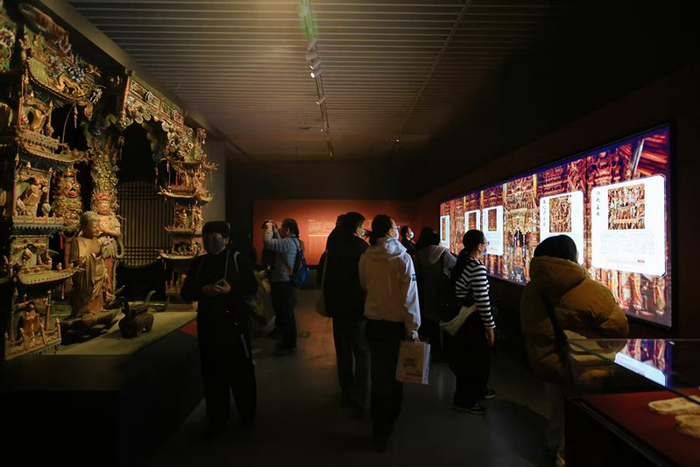 在展览现场,50组84件珍贵文物包括重要碑刻、明清金铜造像精品等,典籍珍本《永乐北藏》也是首次对外展出。展览以壁、梁、柱、檩等建筑构件为依托,以木骨泥塑为章法,以数字化多维手段,展现中国传统雕塑艺术中缜密有序的悬塑艺术。