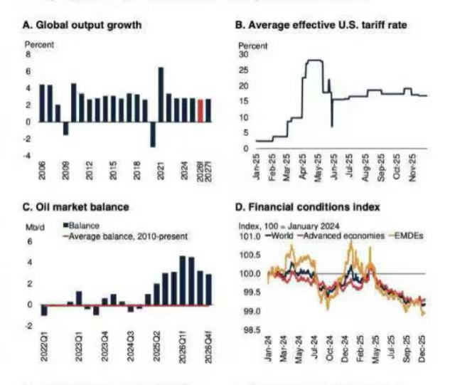 不过报告认为,全球金融条件趋于宽松及多个大型经济体的财政扩张应有助于缓冲经济下行。受劳动力市场趋软及能源价格下降影响,预计2026年全球通胀将微降至2.6%。随着贸易流动逐步适应现状且政策不确定性减弱,2027年经济增速有望回升。