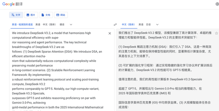 再来看谷歌翻译,将“We introduce DeepSeek-V3.2”翻译成了“我们推出了DeepSeek-V3.2模型”,更接近日常表达,在一些专业词汇上的翻译较为精准,但小缺点是没有对原文断句进行优化。