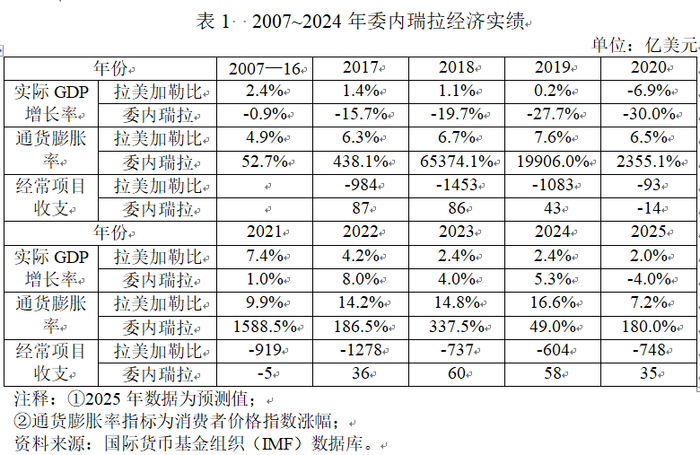 在这方面,查韦斯-马杜罗政府实施的资源民粹主义经济社会政策加重了委内瑞拉的“资源诅咒”问题,即使在拉美加勒比地区这个国际公认经济社会发展失败典型的地区,委内瑞拉在实际GDP增长率、通货膨胀、失业率等主要经济指标上也均远远落后于拉美加勒比地区整体(参见表1),经济规模多年萎缩倒退,社会治安混乱: