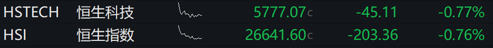 恒生指数跌0.76%,恒生科技指数跌0.77%。医药股、消费股表现疲软,黄金股走高。