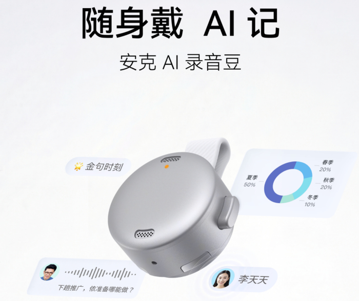 1月19日,安克创新与字节跳动旗下飞书联合发布最新AI硬件——安克AI录音豆。合作关系上,安克创新负责硬件端研发,飞书提供软件AI适配与服务,更多侧重软件、AI 能力支持,以及开放接口,使设备录音可直接接入飞书体系,自动将录音文件导入飞书生态,并沉淀为飞书文档。