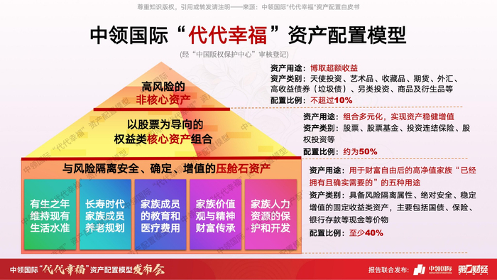 基于这样的时代背景与认知升维,白皮书中构建的中领国际“代代幸福”资产配置模型(下称“模型”)跳出传统金融模型“唯增值论”框架,首次提出“从财富自由到代代幸福”的传承理念,将家族传承核心从“个人生命周期财务自主”,拓展为“跨三代、百年周期的物质财富、价值观与人力资本多元永续”,将物质财富配置与家族生态建设深度绑定,通过清晰的结构设计与财务及非财务的多元价值承载,成为高净值家庭穿越周期的“导航图”。
