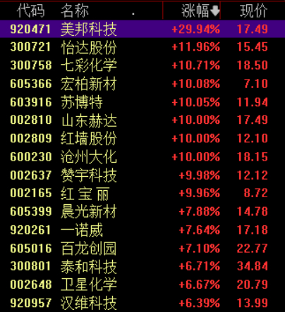 具体来看,化工板块逆势爆发,红宝丽、山东赫达、苏博特、红墙股份等多股涨停。
