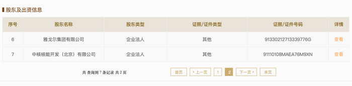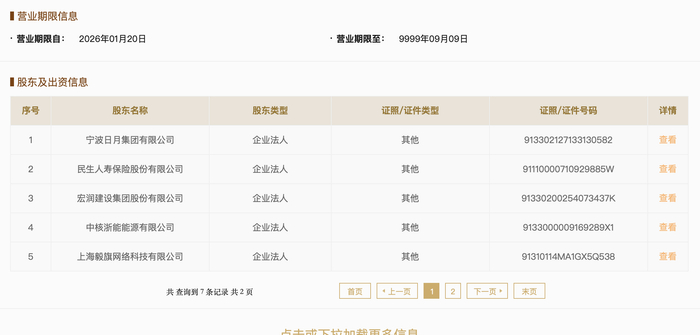 引人关注的是,国家企业信用信息公示系统信息显示,在公司七大股东名单中,雅戈尔赫然在列。其余六大股东分别为宁波日月集团有限公司、民生人寿保险股份有限公司、宏润建设集团股份有限公司(002062.SZ)、中核浙能能源有限公司、上海毅旗网络科技有限公司、中核核能开发(北京)有限公司。