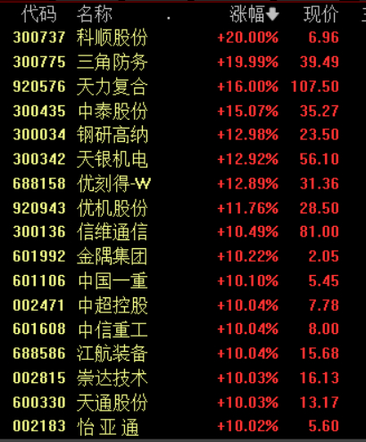 具体来看,商业航天概念爆发,巨力索具2连板,顺灏股份、中超控股、西部材料等超20股涨停。