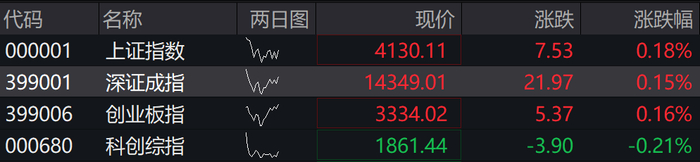 沪指高开0.18%,深成指高开0.15%,创业板指高开0.16%,科创综指低开0.21%。