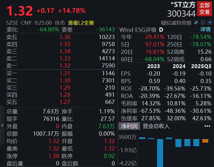 *ST立方高开超14%,安徽证监局发布公告,*ST立方存在重大违法强制退市风险。