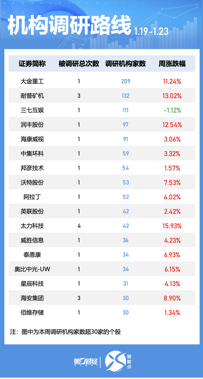 机构本周共调研了167家上市公司,其中大金重工最获关注,参与调研的机构达209家。此外,耐普矿机、三七互娱、润丰股份、海康威视均获超90家机构调研。