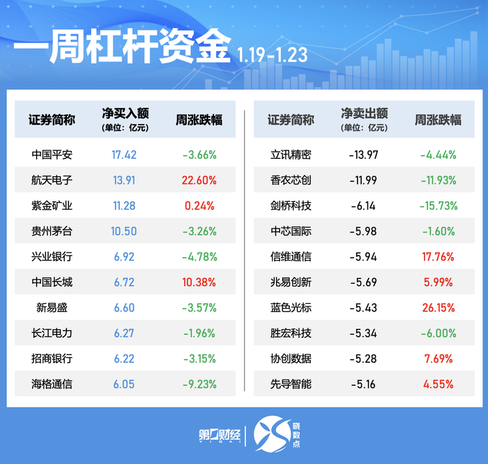 中国平安本周获融资净买入居首,净买入额为17.42 亿元。航天电子、紫金矿业、贵州茅台净买入额居前,金额分别为13.91亿元、11.28亿元、10.5亿元;立讯精密、香农芯创、剑桥科技遭净卖出额居前,金额分别为13.97亿元、11.99亿元、6.14亿元。