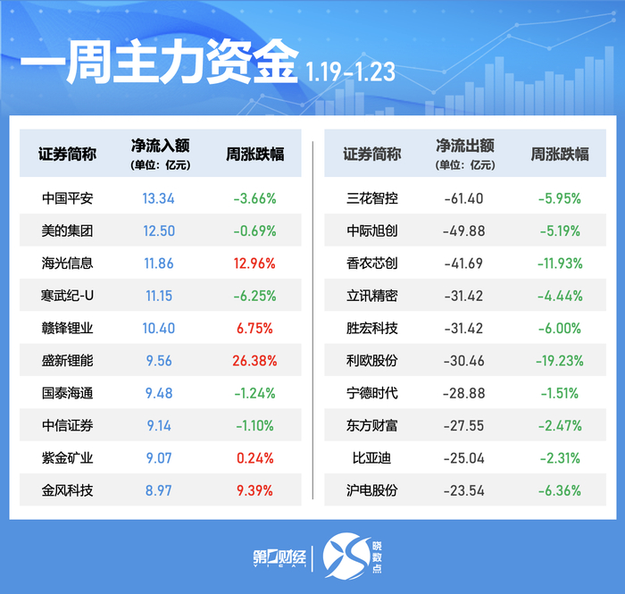 个股方面,本周中国平安、美的集团、海光信息、寒武纪-U、赣锋锂业获主力净流入居前,均超10亿元;净流出方面,三花智控、中际旭创、香农芯创遭主力净流出居前,分别为61.4亿元、49.88亿元、41.69亿元。