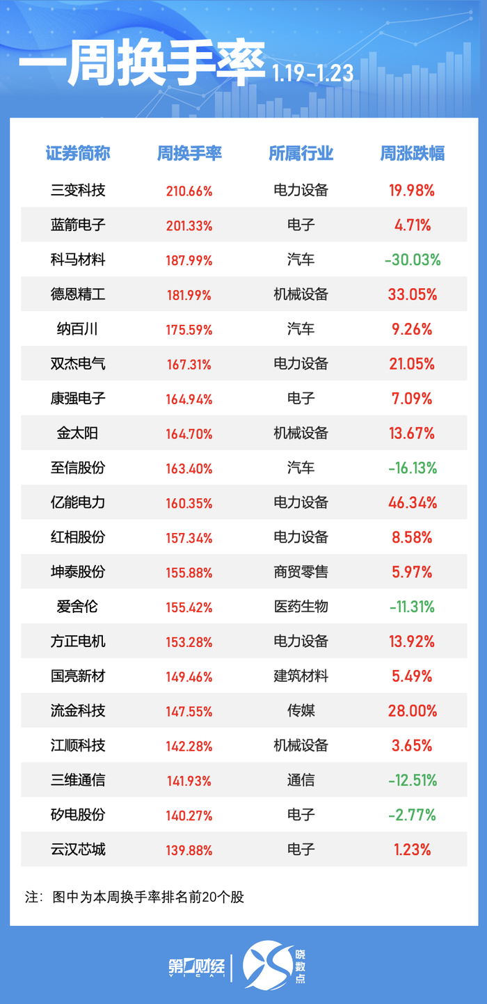 本周五个交易日中有68只个股换手率超过100%。其中,三变科技排名居首,周换手率达到210.66%;此外,蓝箭电子本周换手率超200%。