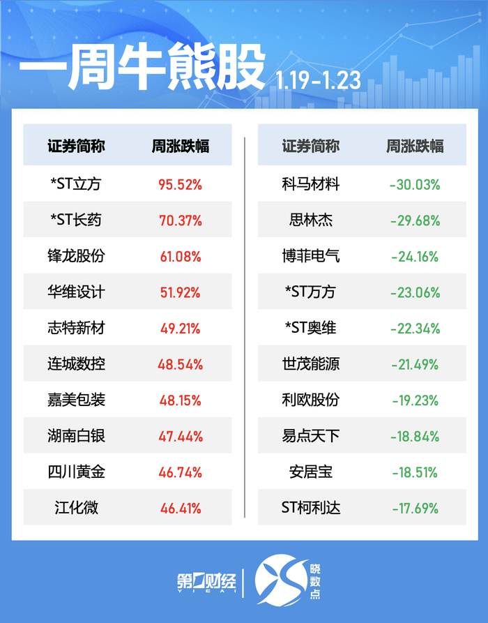 此外,本周多只贵金属股走势活跃,湖南白银周涨47.44%,四川黄金周涨46.74%。