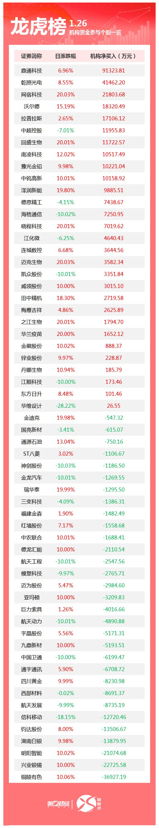 盘后数据显示,1月26日龙虎榜中,共60只个股出现了机构的身影,有29只股票呈现机构净买入,31只股票呈现机构净卖出。