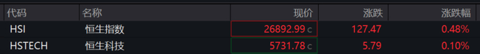 恒生指数涨0.36%,恒生科技指数涨0.16%;紫金矿业高开4.31%,哔哩哔哩、比亚迪股份、蔚来走强,百度集团、新东方走弱。