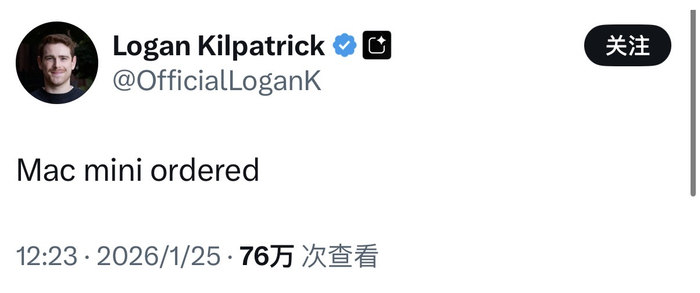 这一AI助手甚至带火了苹果Mac mini,有不少人为了让Clawdbot 24 小时在线运行,专门去下单了一台,谷歌AI产品负责人Logan Kilpatrick就是其中之一。