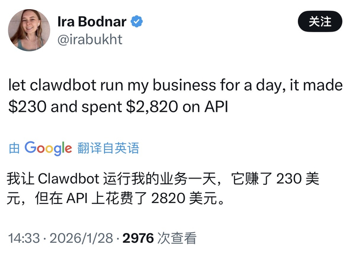 有用户在X上吐槽,“让Clawdbot 运行我的业务一天,它赚了 230美元,但在API 上花费了2820美元。”也有用户反馈Clawdbot是“token杀手”,因为100美元只能维持20个小时,“每月可能要花费3000美元,这几乎相当于雇佣一名真正的秘书。”