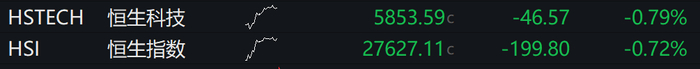 恒生指数低开0.72%,恒生科技指数跌0.79%。蔚来跌逾3%,京东集团跌逾2%,小鹏汽车、携程集团、阿里巴巴等纷纷走低。