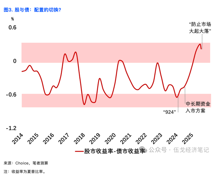 在“防止市场大起大落”的要求下,未来市场风险偏好运行的斜率和路径,似存在类似于宏观经济逆周期调节的区间特征,股债的性价比或也将随之边际调整。
