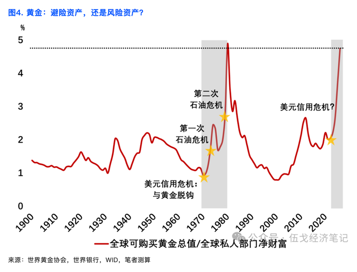 地缘风险之下金价有着“必然”趋势,但限于该市场的深度,普通居民进行配置存在择时等技术难度。上世纪70年代布雷顿森林体系解体,叠加两次石油危机引致的滞胀冲击之下,黄金总价值在全球私人财富中占比曾一度飙升,但最终不足5%。