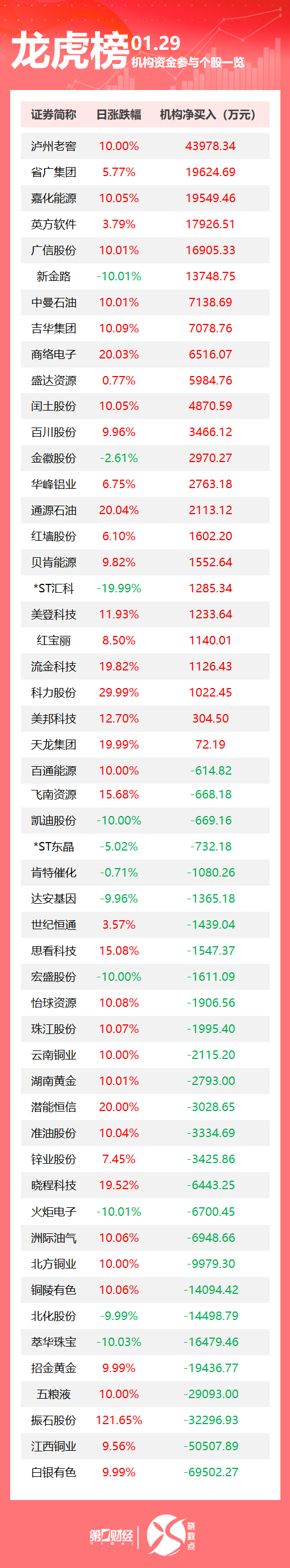 盘后数据显示,1月29日龙虎榜中,共52只个股出现了机构的身影,24只股票呈现机构净买入,28只股票呈现机构净卖出。