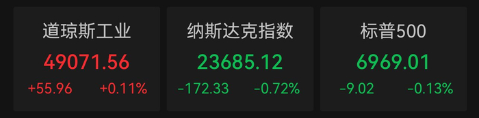 截至当天收盘,道琼斯工业平均指数上涨55.96点,报49071.56点;标普500指数下跌9.02点,报6969.01点;纳斯达克综合指数下跌172.33点,报23685.12点。
