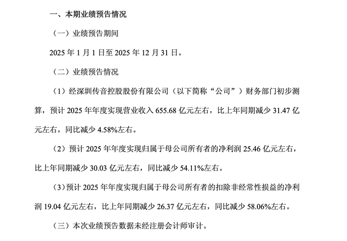 1月29日晚,深圳传音控股股份有限公司(688036.SH)发布2025年年度业绩预告,预计全年实现营业收入约655.68亿元,同比下降约4.6%;归属于母公司股东的净利润约25.46亿元,同比大幅下降54.11%。这也是该公司上市以来首次出现净利润“腰斩”。