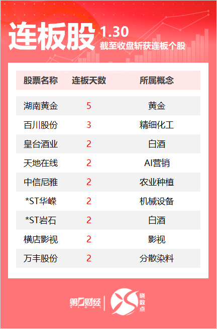 1月30日,Wind数据显示,A股市场共计59只个股涨停。其中黄金股湖南黄金5连板,白酒股皇台酒业2连板。一图速览今日连板股>>