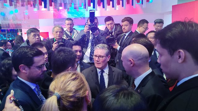 在招待酒会上,不少英国企业在中心舞台周边搭台,推荐自己的产品。斯塔默在致辞后,一家一家地参观了起来,虽然时间紧迫,他并没有蜻蜓点水,而是和中英企业家认真地攀谈。