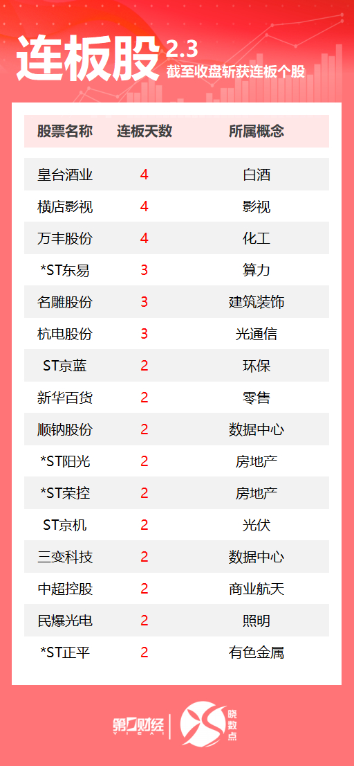 2月3日,Wind数据显示,A股市场共计83只个股涨停。其中白酒股皇台酒业收获4连板,光通信板块杭电股份3连板,数据中心概念股顺钠股份、三变科技2连板。一图速览今日连板股>>