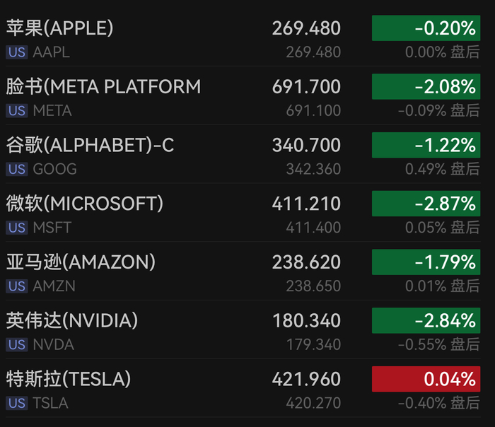 大型科技股普遍承压。英伟达收跌2.84%,连续第三个交易日回落。微软下跌2.87%,特斯拉基本持平、微涨0.04%,苹果回落0.20%。AlphabetA类股下跌1.16%,C类股跌1.22%;亚马逊下挫1.79%,博通跌幅达3.26%,超威半导体下跌1.69%,Meta Platforms下滑2.08%。