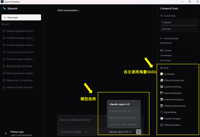 系统可根据任务自动筛选并推荐最适合的Skills和模型,提高多任务处理效率,让用户操作更省心。用户亦可手动选择Skills和模型去解决多任务场景痛点,让操作更灵活。